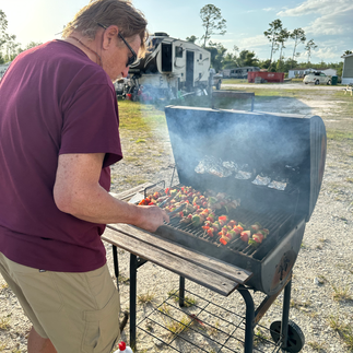 For dinner, Tom and I prepared the meat and sides from James's package and we also made marinated chicken kebabs. The RV park owners gave us a charcoal grill to use with a lid and a temperature gauge so we were able to warm most of the food in it and also grill the kebabs. A microwave was also utilized from the park's tiki lounge/rec room. It appeared that the area was underutilized. The meal was a success!